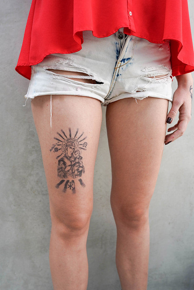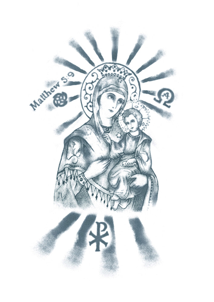 Temporary tattoo contains Virgin Mary with Jesus design.