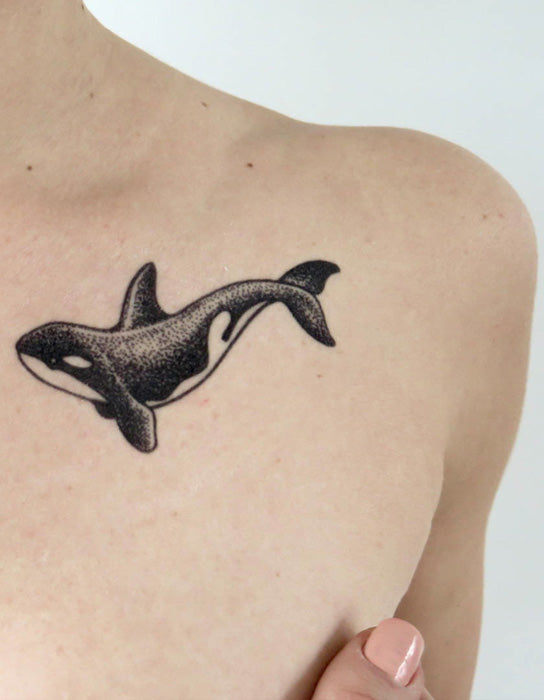 Tatuaje temporal de ballena orca en estilo puntillista
