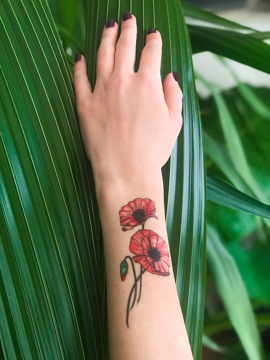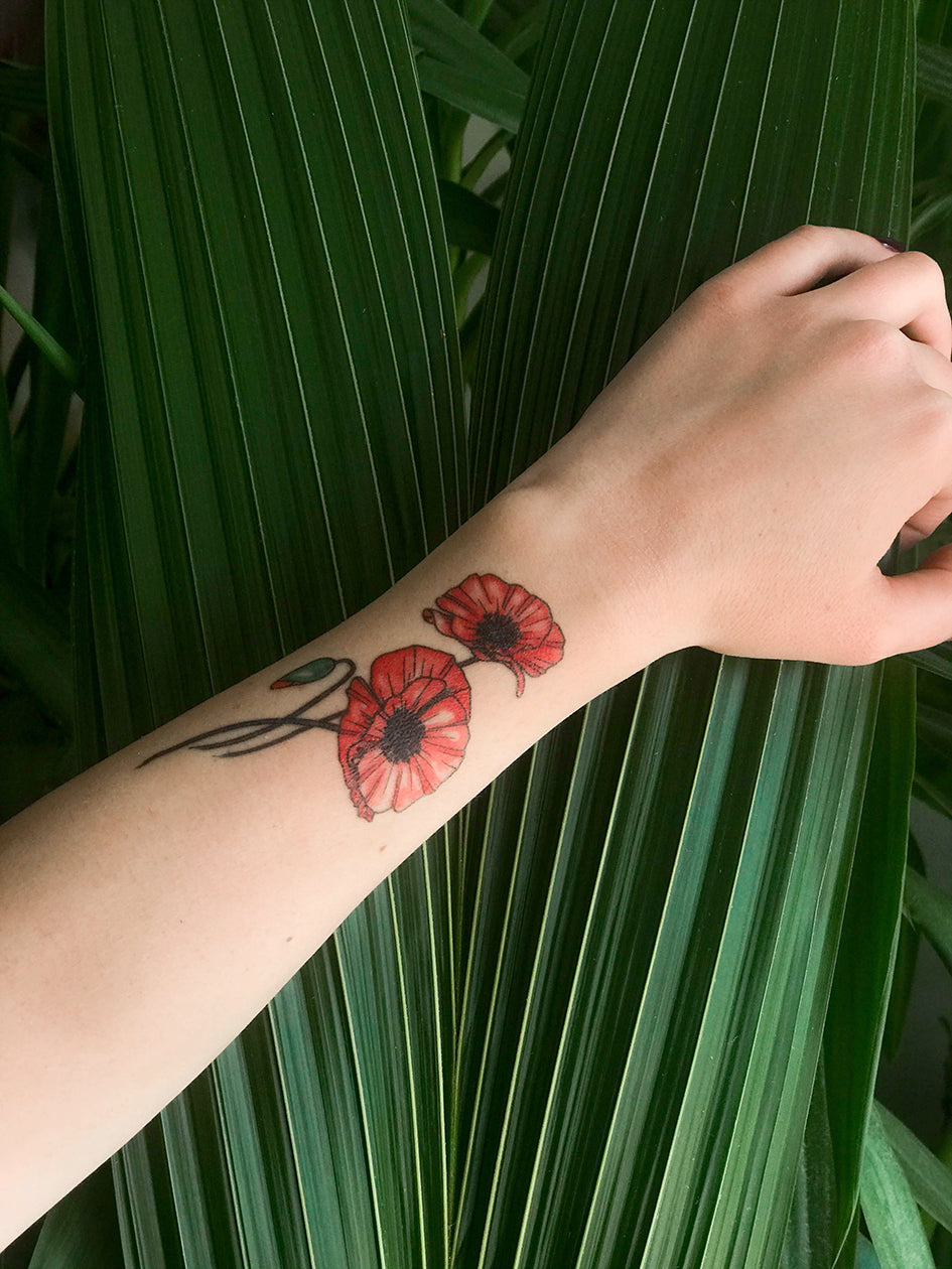 El tatuaje temporal contiene un diseño en color de la flor de amapola.