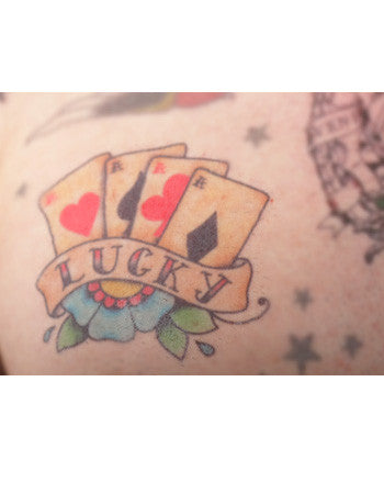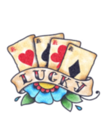 Temporary tattoo contains color card suit design with 'Lucky' banner.