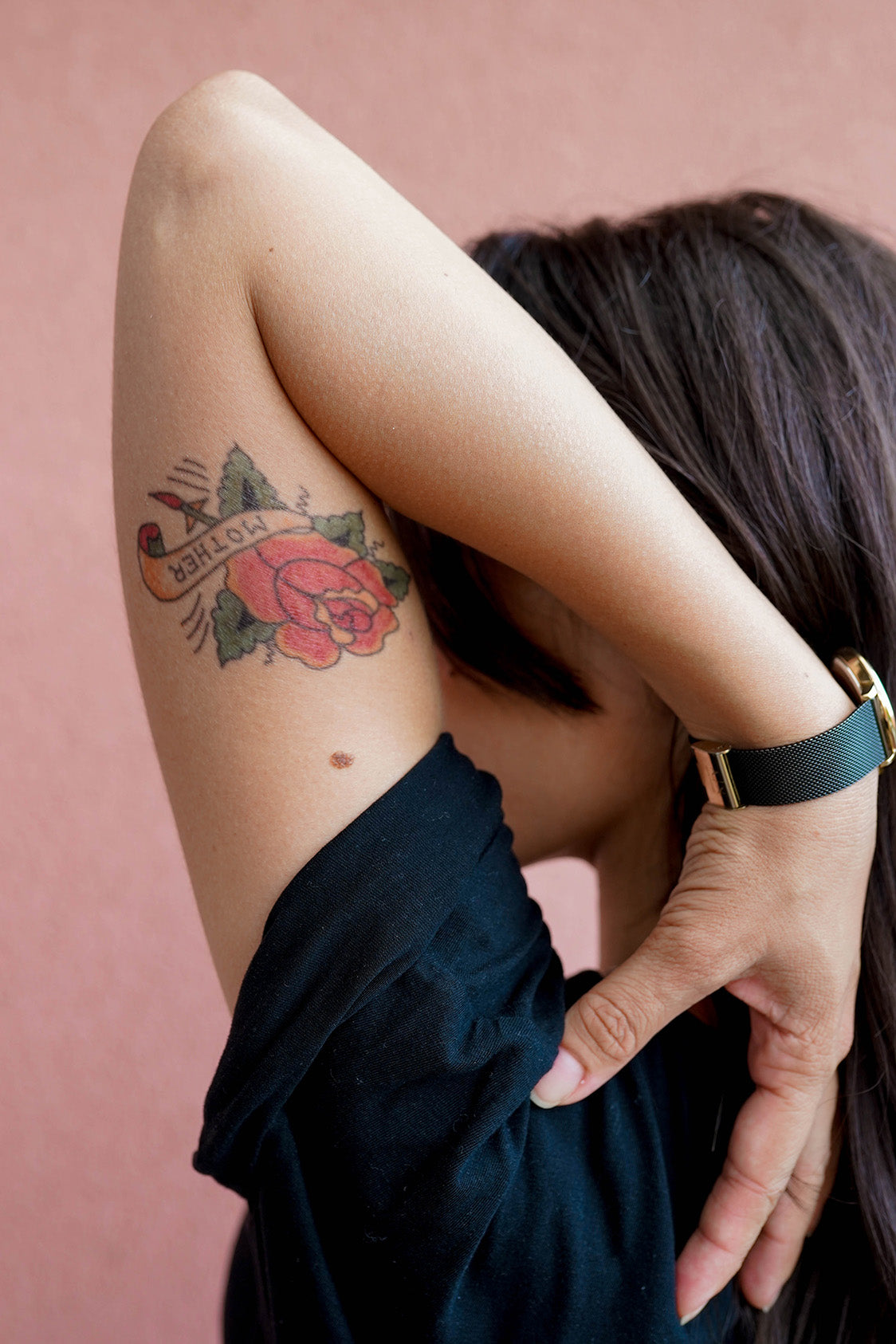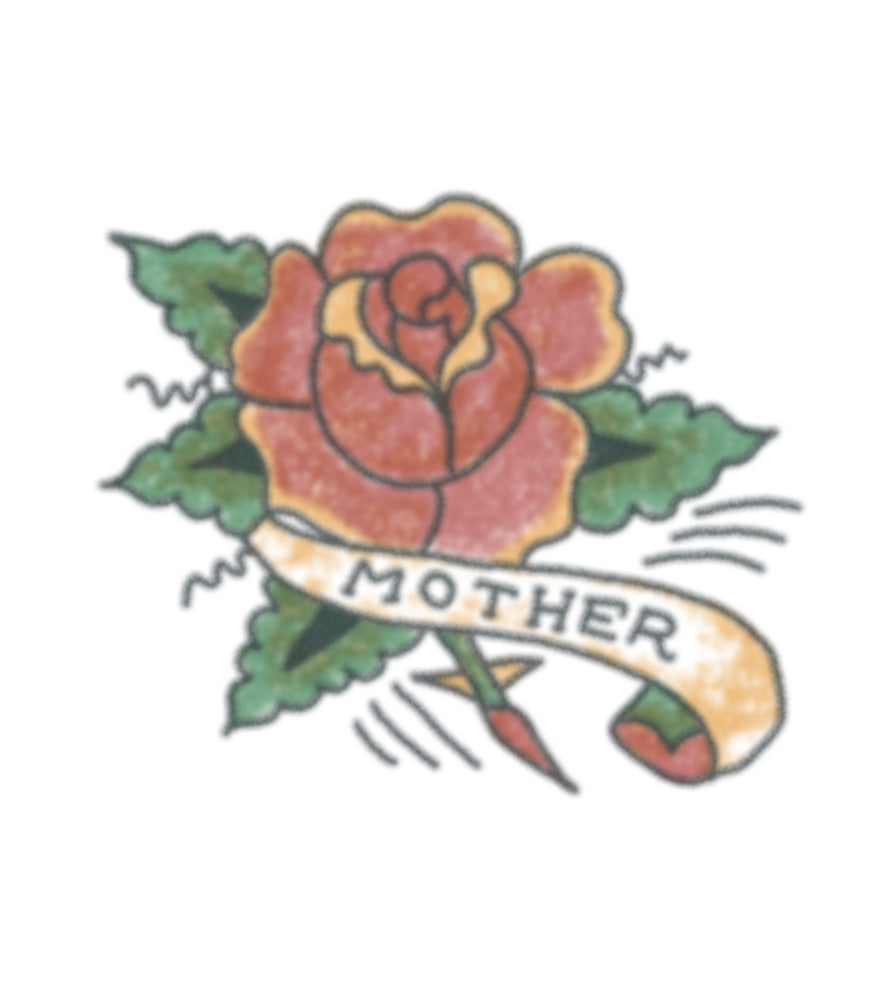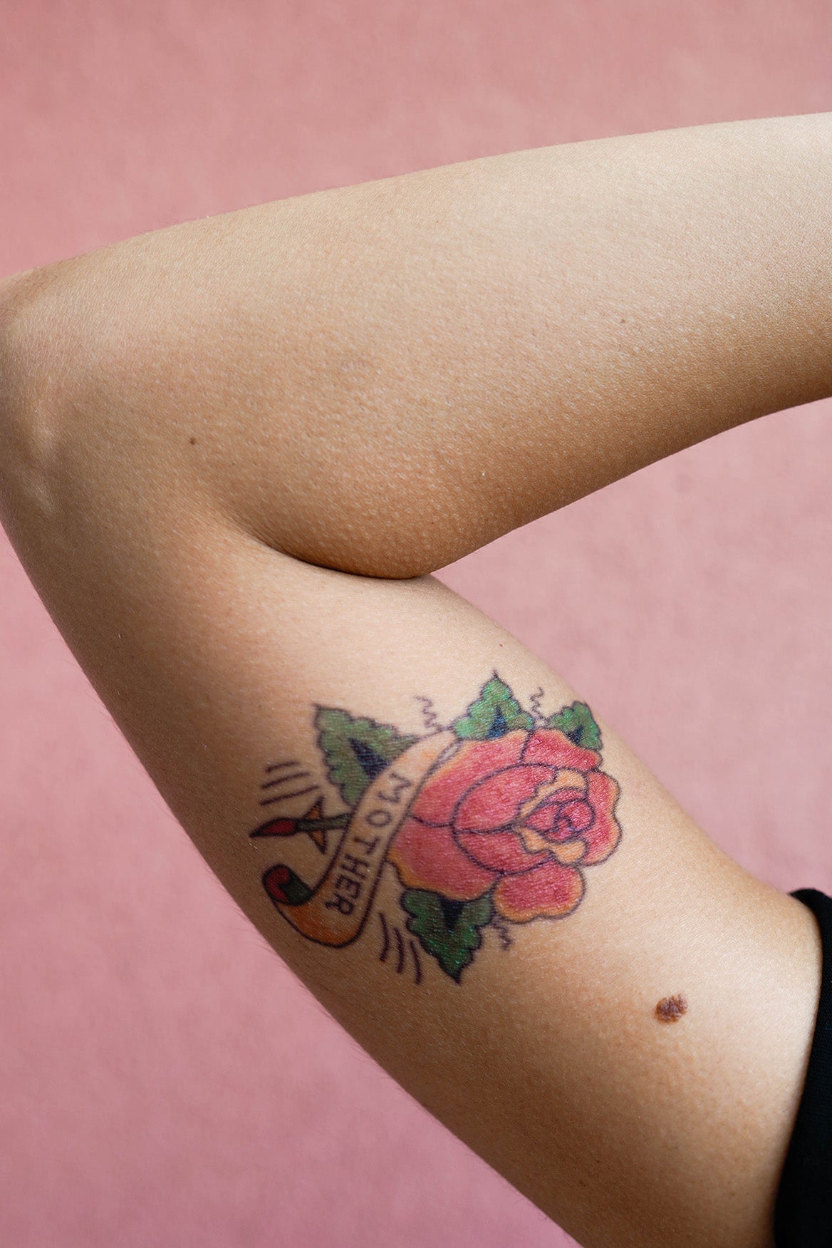 Temporary tattoo contains traditional color rose design with 'Mother' banner.