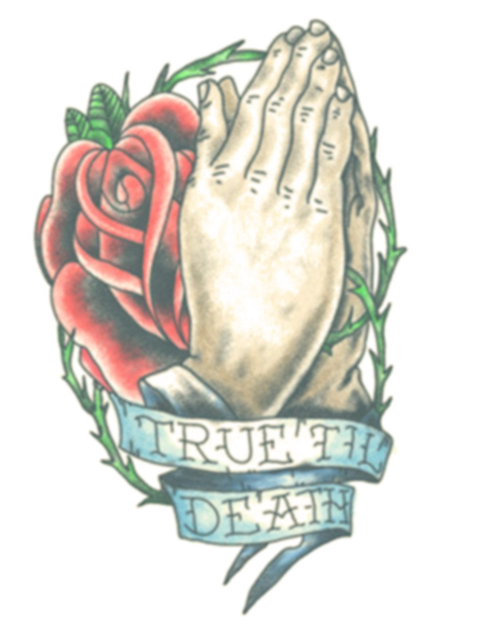 Temporary tattoo contains Praying Hands color design with 'True till death' script.