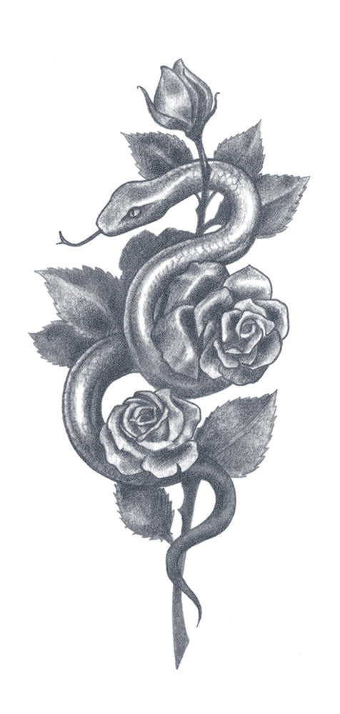 The Rose and Snake tattoo melds beauty with danger, symbolising a complex interplay of love, temptation, and sacrifice. The rose traditionally represents love, beauty, and passion, whereas the snake introduces elements of wisdom, sin, and rebirth. This tattoo can signify the struggles and risks inherent in love, highlighting the pain that often accompanies deep affection. Ideal for those who see love as a transformative, albeit perilous, journey, this design encapsulates the beautiful yet thorny aspects of intimate relationships.