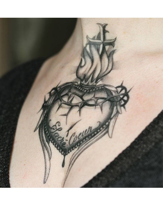 The Sacred Heart with a cross tattoo is a powerful emblem of Christian faith, representing Jesus Christ's divine love for humanity and his sacrifice. The heart topped with flames, symbolizes purity tested by suffering, and the addition of a cross emphasizes redemption and unwavering faith. It's often chosen by those who wish to express their deep religious commitment and a reminder of divine love and sacrifice.